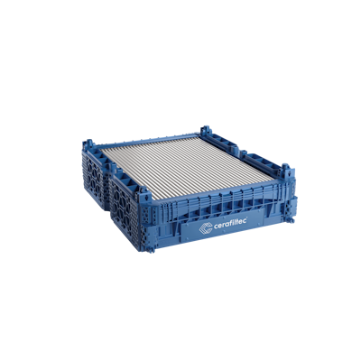 This filtration module with ceramic flat membranes is suitable for submerged applications. It features a multi ceramic plate configuration with exchangeable single ceramic plates and internal filtered water piping.